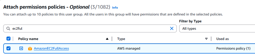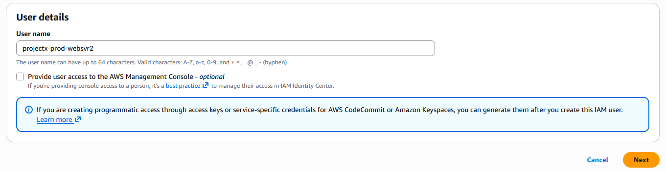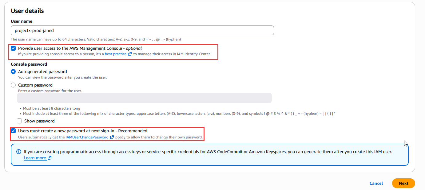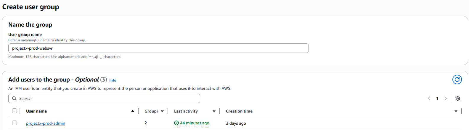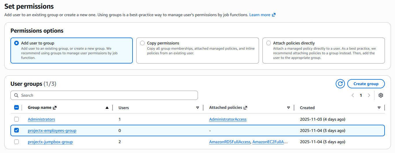 In the "User groups" section, add this IAM user under the projectx-employees-group.