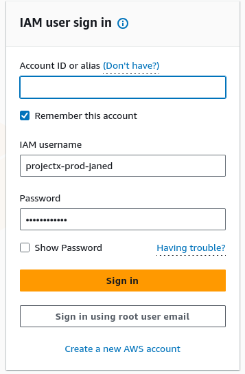 Copy-paste your AWS Account ID, projectx-prod-janed, and the password. You will have to change the password upon first login.