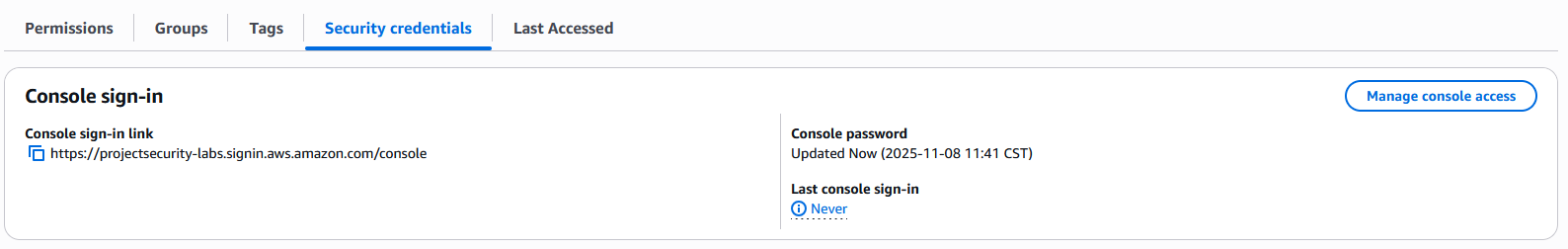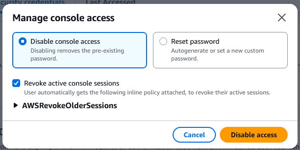 Go to "Users" ➔ projectx-prod-janed ➔ Security Credentials ➔ "Disable console access".