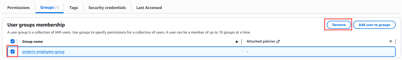 Under "Groups" ➔ Select projectx-prod-employees ➔ "Remove".